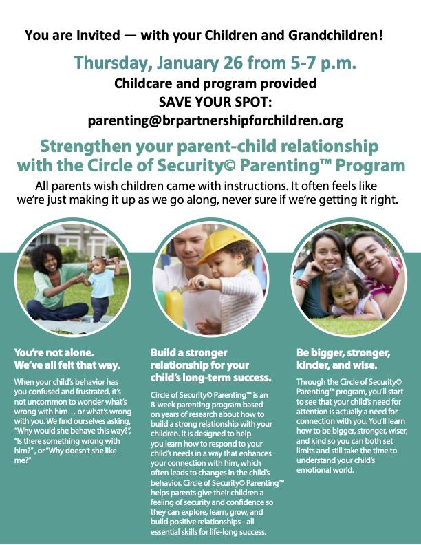 Circle of Security Parenting™ is an 8-week parenting program based on years of research about how to build a strong relationship with your children. It is designed to help you learn how to respond to your child's needs in a way that enhances your connection with him, which often leads to changes in the child's behavior. Circle of Security Parenting™ helps parents give their children a feeling of security and confidence so they can explore, learn, grow, and build positive relationships - all essential skills for life-long success.